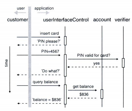 Use case 의 예로, "현금 자동 입출금기에 계좌의 잔고를 요청하라." 를 들 수 있겠다. 이러한 use case 의 상세한 표시는 "고객이 카드를 넣고, 기계가 PIN 을 요청한다..." 가 되겠다. 이와 같은 텍스트 설명은 번거롭거나 모호할 수 있으므로 디자이너는 아래와 같은 상호 작용 다이어그램을 그려볼 수 있다: