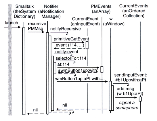 이 시나리오는 특정 스몰토크(Smalltalk/V), 특정 운영체제(OS/2), 윈도우 매니저(Presentation Manager, 또는 PM)에 적용된다. 그러한 환경에서 이벤트 처리를 염려하는 우리 중 몇몇은 이 도표를 수년간 참조용으로 사용하기도, 사용을 중지하기도 했다.[2] 도표가 자신의 문제에 연관된 경우는 거의 없으므로 그 세부내용은 연구하지 말아야 한다. 하지만 자신만의 문제로 제한된 복잡한 시나리오에서 그 외 다른 use cases나 상호 작용 다이어그램은 자신의 개발 팀에 귀중한 자료가 될 것이다. 손으로 대충 그린 그림이라 하더라도 그릴 만한 가치가 있다. (110 페이지부터 시작되는 분석 및 디자인 논의의 예를 살펴보라.) 얼마나 기본적인지와 상관없이 자신만의 스케치를 유지하라. 다른 개발자들이 고마워할 뿐만 아니라 검사자들은 상속이나 집합 도표보다 use cases와 상호 작용 다이어그램을 더 유용하게 사용함을 발견할 것이다. 검사자들은 클래스와 객체 간 정적 관계가 아니라 소프트웨어가 하는 일을 검사한다.