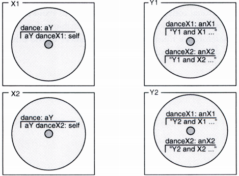 해답은 Dan Ingalls [Ingalls 1986]이 처음 발표한 기법을 사용하는 것이다. 첫째, dancers 중 하나를 선호하는 대상 x로 지정한다. 여기에 dance: y를 전송하고, 다른 객체 y를 argument로서 전달한다. 이제 x는 y 상에 행위의 도움을 필요로 할 것이기 때문에 danceX:x 메시지를 y로 재전송하여 이 행위를 호출하면서 아래와 같이 자신을 argument로서 전달할 것이다: