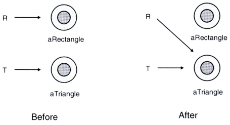 R := T라는 지정문은 R을 바꿔 그 또한 triangle 객체를 가리키도록 한다. 이것은 스몰토크에선 타입 오류에 해당하지 않는다.