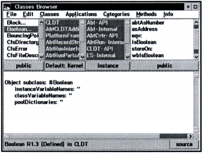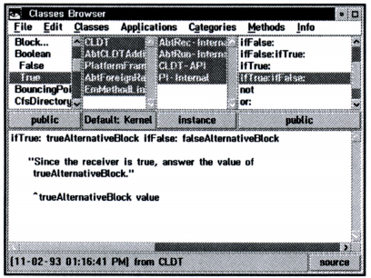 ifTrue:ifFalse: 메서드를 구현하는 클래스에 대해 실행 가능한 첫 번째 추측은 Boolean 클래스이다. 하지만 브라우저는 그러한 메서드를 표시하지 않는다: