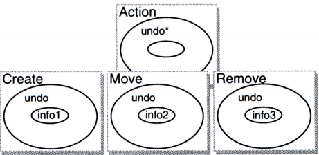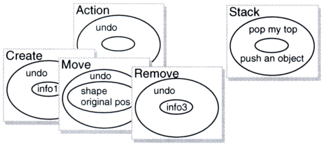 undo하는 것은 슈퍼클래스의 subclassResponsibility-아무 일도 하지 않는다-이지만 3개의 서브클래스들의 구체적 책임으로, 서브클래스 각각은 고유의 방식으로 수행한다. 이들은 의무적으로 수행해야 하는 정보는 무조건 유지할 것이다 (인스턴스 변수의 형태로). 예를 들어, Move 객체가 스스로를 undo하는 유일한 수단은 이동되는 shape 인스턴스에 관해서, 그리고 그것이 어디에서 왔는지를 아는 것과 관련된다. 따라서 위 그림에서 Move 인스턴스 내부에 있는 정보는 최소한 shape와 shape의 본래 위치를 나타내는 인스턴스 변수들로 구성된다. (이러한 인스턴스 변수는 다음 절에서 코드를 작업할 때 찾아보라.)