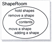 contents란 이름의 인스턴스 변수는 ShapeRoom이 어떻게 컨테이너와 같은 의무를 충족할 것인지를 제시함을 주목하라: 이 인스턴스 변수는 OrderedCollection 클래스를 참조해야 하는데, 어쩌면 Set의 인스턴스가 될 수도 있다. 다시 말해, ShapeRoom은 그것의 shape 객체들을 포함하기 위해 일반 스몰토크 컬렉션을 구매한다.