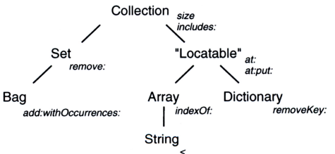 각 타입에는 타입과 타입의 서브타입에 관계가 있는 메시지 선택자들의 이름이 붙어 있다. 만들어낸 타입인 Locatable을 주목하라. 이는 우리가 Array와 Dictionary, 그리고 그들의 서브타입을 제공하는 선택자 at:과 at:put:을 팩토링할 수 있는 편리한 타입이다.