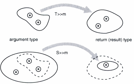 T>>m보다 S>>m이 리턴하는 객체가 적음을 주목하라-모든 알이 아니라 오리 알만 해당한다. 이것이 핵심이다. S>>m이 리턴하는 객체는 좀 더 구체적이다; T>>m이 리턴하는 객체의 서브타입이나 서브셋을 나타낸다.
