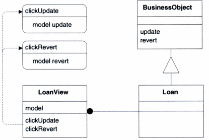 프로그래머가 하는 일. 블랙박스 재사용의 또 다른 예제다. 사용자가 변경 내용을 적용하거나(committing) 되돌리는(reverting) 버튼을 클릭할 수 있다고 가정하면, 프로그래머는 각각 Loan>>update 또는 Loan>>revert를 호출함으로써 클릭 이벤트에 응답하는 코드를 작성한다. 이러한 메서드는 사실 BusinessObject에서 상속되므로 나머지는 프레임워크가 한다.