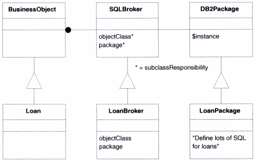 프레임워크는 브로커, 패키지, 비즈니스 객체들의 클래스의 특정 조합이 함께 작용하여-예: LoanBroker는 Customer 객체를 실체화하는 데에 효과가 없을 것이다-이러한 클래스들을 연결하는 Broker>>objectClass와 Broker>>package란 이름의 subclassResponsibility 메서드를 선언함을 알아야 한다.