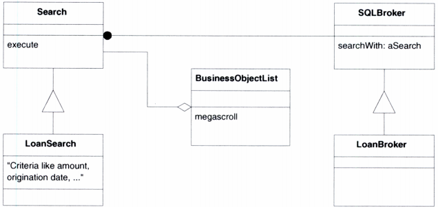 Search 객체는 실제로 서버로부터 객체를 검색하기 위해 broker와 협력해야 한다는 사실을 주목하라. 또한 BusinessObjectList는 내용을 생성한 search 객체를 알아야지만 메타 스크롤을 실행 시 이 검색을 재실행할 수 있음을 주목한다.