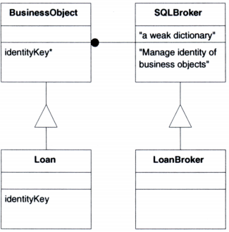 프레임워크가 하는 일. Broker는 그것이 실체화한 모든 객체에 대한 dictionary를 포함한다. Dictionary 내 모든 엔트리는 객체에 대한 유일한 기술자를 키(key)로 가지며, 객체 자체를 값으로 가진다. 따라서 100,000개의 loans는 서버 데이터베이스로 보관되고, LoanBroker는 그 중 29개를 실체화하며, 29개 엔트리는 LoanBroker의 dictionary에 위치할 것이다. 그들 각각은 키-어쩌면 loan의 대출 번호-와 loan 객체 자체에 해당하는 값으로 구성된다. 은행가가 다른 loan 객체를 요청할 경우 프레임워크는 loan의 대출 번호가 dictionary에 이미 위치한 29개의 키 중 하나에 해당하는지 검사한다. 일치할 경우, 다른 복사본을 실체화해서는 안 되는데, 만일 그럴 경우 또 위와 같이 바람직하지 못한 시나리오가 발생한다. 이 모든 것이 올바로 작동하기 위해선 그 business 객체들에게 무엇을 키로 사용해야 하는지 브로커가 분명히 알아야 한다. 따라서 BusinessObject 클래스는 identityKey라 불리는 subclassResponsibility 메서드를 갖고 있다. 브로커는 이 메서드를 이용해 그것의 dictionary 내 엔트리를 관리하고, 특히 dictionary에 business 객체가 이미 존재하는지 결정한다.