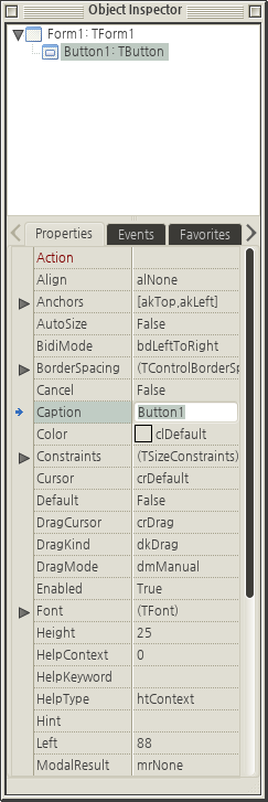 Object Inspector 창에서 버튼의 속성(캡션 이름, 폭 등)을 표시할 수 있습니다. 라자루스 창에서 나타나지 않는다면, 메인메뉴에서 Window/Object Inspector 를 마우스로 누르거나, F11 키를 눌러서 표시할 수 있습니다. 이제 다음 창을 보게 될 것입니다.
