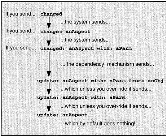 첫 번째 메시지가 가장 강력하다. 해당 메시지를 구현했다면, 당신의 객체는 그것이 의존하는 다른 객체가 '변경된' 메시지 중 어떤 것이든 수신할 때마다 해당 메시지를 수신할 것이다. anAspect와 aParameter의 값은 '변경된' 메시지에서 사용되고, 혹은 더 단순한 '변경된' 메시지들 중 하나가 사용될 경우는 nil이 될 것이다. anObject의 값은 '변경된' 메시지가 전송되는 객체로서, 이것이 포함됨으로 인해 '업데이트' 메시지가 발생한 곳을 알 수 있다.