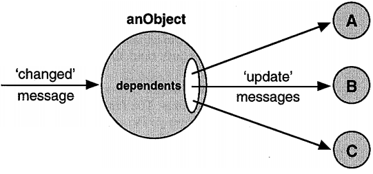 의존성 메커니즘에서 가장 중요한 부분은 다음과 같다. 객체에게 '변경된' 메시지가 전송될 때마다 객체는 자동으로 그 모든 종속자에게 '업데이트' 메시지를 전송할 것이다. 물론 스몰토크의 모든 것과 마찬가지로 이러한 자동적 행위는 숨겨지지 않는다. Object의 변화하는 프로토콜에서 볼 수 있도록 되어 있다. 하지만 최상의 실용성을 위해서는 그것을 마법으로 간주하라. 객체가 '변경된' 메시지를 수신하면 그 모든 종속자들은 마법처럼 '업데이트' 메시지를 수신할 것이다.