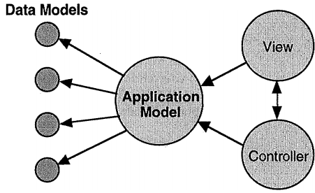 기본적인 수정은 MVC의 모델 부분을 두 조각으로 나누는 데 있다. 이를 주로 데이터 모델과 애플리케이션 모델이라 부른다. 이러한 분리는 많은 모델 객체들이 가진 이중적 역할을 반영한다-그들은 애플리케이션의 데이터를 저장하는 저장소 역할을 하기도 하고 애플리케이션 특정적 방식으로 데이터를 실행하기도 한다. 다음 페이지에 실린 다이어그램은 결과가 되는 아키텍처의 모습을 보여준다. VisualWorks 툴을 이용해 자신의 애플리케이션의 사용자 인터페이스를 빌드할 경우, 이와 비슷한 모양의 아키텍처를 구성할 것이다.