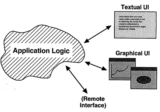 애플리케이션을 UI로부터 분리하면 둘을 따로 개발하도록 허용한다. 더 중요한 것은, 새롭고 다른 UI를 쉽게 기존 애플리케이션으로 연결하도록 해준다는 것이다. 뿐만 아니라 기존 UI의 구성요소(component)들을 새 애플리케이션에서 재사용되도록 허용하기도 한다. 마지막으로 UI가 없이 다른 애플리케이션에 의해 사용되도록 해준다. 아래 다이어그램은 이러한 옵션을 보여준다. 이러한 이유들은 모두 객체 지향성이 추진하는 모듈성(modularity), 재사용 가능성, 캡슐화에 연관됨을 볼 수 있을 것이다.