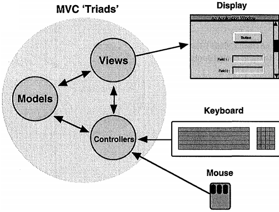 이제 애플리케이션 내 모델, 뷰, 컨트롤러가 어떻게 힘을 모아 애플리케이션의 기능을 구현하고 사용자에게 제시하여 사용자가 애플리케이션과 상호작용하도록 해주는지에 대해 기본적인 개념을 구축하였을 것이다. 다음으로 제시된 다이어그램에서 볼 수 있듯이, 모델, 뷰, 컨트롤러는 협력하는 객체들의 조그만 'triad(3자 관계)'를 형성하는 경향이 있다. 각 모델 객체는 화면으로 접속되고, 키보드와 마우스는 뷰 객체와 컨트롤러 객체에 의해 접속된다.