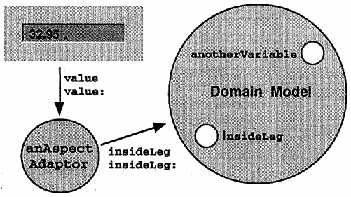 AspectAdaptor는 ValueHolder와 비슷하지만, 좀 더 복잡한 모델에게 인터페이스를 제공한다. 가령 당신은 문자열, 숫자 등을 보관하는 여러 인스턴스 변수와 함께 클래스를 제공했을 수 있다. 그러한 인스턴스 변수에 대해 'get'과 'set' 메서드를 생성했을지도 모른다. 이러한 메서드명은 인스턴스 변수명과 동일해야만 insideLeg와 insideLeg: 라는 메서드를 가져 insideLeg 변수의 값을 얻고 설정할 수 있다 (아래 다이어그램 참조). 이제 TextEditorView에서 이러한 변수의 값을 표시하고 편집하길 원할 것이다. 하지만 뷰는 그것이 표시하는 객체 값을 얻고 설정하고자 할 때 value와 value: 메시지를 전송한다. 따라서 메시지를 당신의 클래스가 이해하는 것으로 변환할 방법이 필요하다. 그것이 바로 AspectAdaptor가 하는 일이다.