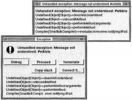 VisualWorks 2.0 과 (앞) 스몰토크 초기 버전의 (뒤) 통지자. 둘 다 nil이 wibble 메시지를 이해할 수 없음을 시스템이 인식할 때 생성된다.