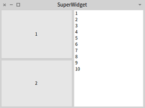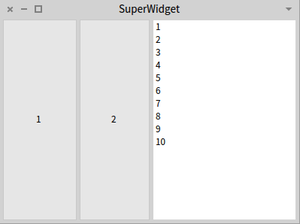 위 코드의 TBAndListH 클래스는, 그림 4-1 처험 SuperWidget 창을 생성합니다. TwoButton 위젯은, TwoButton 위젯의 buttonRow 레이아웃 메서드를 사용하기 때문에 세개의 위젯을 전부 수평으로 배치합니다.