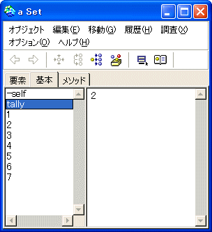 예시에 있는 첫행에서는 임시변수(mySet)이 선언되어 있습니다. 두 번째 행에서는 새로운 Set 객체를 작성하기 위해서 스몰토크에 지시하고, 임시변수에 대입합니다. 세 번째 행에서는 Set 객체에 'dog'문자열을 추가합니다. 다음 행에서는 Set 객체에 'cat' 문자열을 추가합니다. 다음 행에서는 Set 객체에 'dog' 문자열을 추가합니다. 그리고 Set 객체의 Inspector를 스몰토크에 지시합니다.