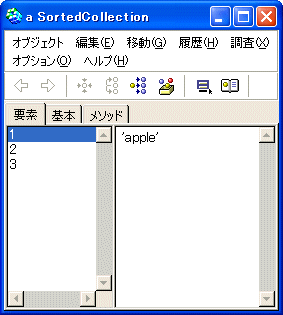 최초 행에서는 임시변수 mySort를 선언하였습니다. 두 번째 행에서는 새로운 SortedCollection객체의 작성을 스몰토크에 지시하고, 임시변수에 대입했습니다. 세 번째 행에서는 SortedCollection 객체에 'cat'문자열을 추가했습니다. 다음 행에서는 SortedCollection 객체에 'apple' 문자열을 추가하고, 마지막은 'dog' 문자열을 추가했습니다. 그리고 SortedCollection 객체를 Inspect하는 지시를 Smalltalk에 지시했습니다.