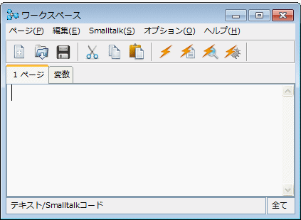 VisualWorks에서 Smalltalk 코드를 쓰는 간단한 방법은 Workspace를 사용하는 것입니다. Workspace를 Smalltalk 코드 입력 및 테스트를 할 수 있는 장소입니다. Workspace를 열기 위해서는 VisualWorks 메인 런쳐 윈도우에서 툴바 맨뒤 버튼을 클릭하거나, Toolbar>>Workspace 메뉴를 선택해주십시오. 이로써 새 창(Workspace)이 열립니다. 그림 2-1 참조.