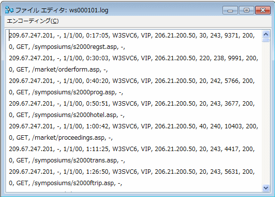 여기서 웹서버의 로그파일은 콤마로 15개로 구분된 아스키 텍스트 파일입니다. 이것들의 필드 중 몇 가지는 보면 알지만 그 이외는 잘 모를 것입니다. 맨 오른쪽에 있는 필드는 웹사이트에 방문한 IP 어드레스입니다. 다음 연습에서는 그것들을 카운트해봅시다.