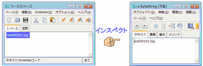 반전시킨 문자열에 주목합니다. 이것은 single quotes로 둘러싸인 문자열을 인스팩트(조사)하듯 Smalltalk에 전달하여, 그 결과를 바이트 문자열로 표시하였습니다. 컴퓨터이기에 전달 받은 그대로 실행했을 뿐입니다. Smalltalk는 표시된 내용의 문자열이 컴퓨터 파일을 의미한다고 생각하지 않습니다. 만일 문자열에 의미를 부여하려 한다면 Smalltalk에 지시할 필요가 있습니다.