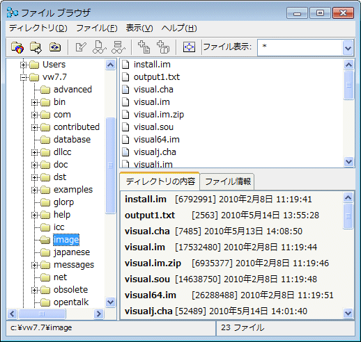 이것은 File Browser 화면입니다. 이 화면의 사용 방법은 다음 레슨에서 배우겠습니다만, 왼쪽 뷰에서 반전된 디렉토리에 주목해 주시기 바랍니다. 이것은 VisualWorks "표준 디렉토리"의 이름을 표시합니다. 이 예시에서는 윈도우계열 시스템이 사용되었으며, VisualWorks "표준 디렉토리"는 c:\vw7.7\image입니다. 이 튜토리얼을 작성하는 동안 로그파일을 위치시킨 곳입니다.