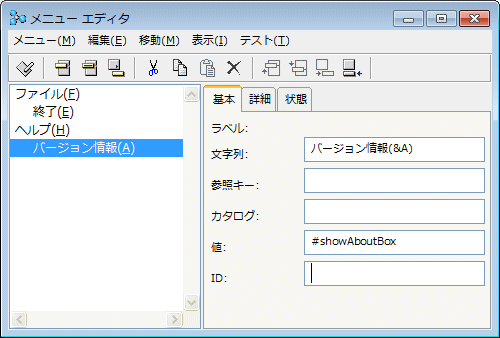 22. 메뉴 에디터 윈도우에서 편집 메뉴를 선택하고, 신규 서브 메뉴 항목을 선택하거나, 툴바에서 네 번째 버튼을 클릭해주십시오. 문자열:<신규항목>Version Information(&A)로 변경합니다. 값:입력 필드에 showAboutBox를 입력합니다. 리턴 혹은 엔터키를 누릅니다.