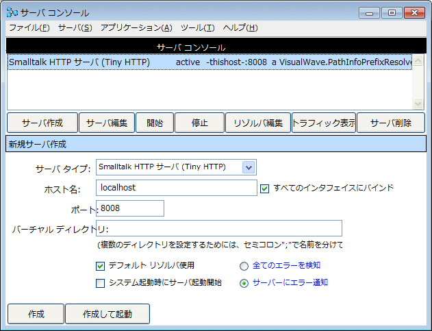 8. 작성후 기동 버튼을 클릭합니다. 서버 리스트에 추가됩니다. ![]() 여러분의 기기가 접속되어있는 네트워크상의 기기로부터, Web 브라우저를 사용해서 포트 8008을 통해 접속 가능합니다.