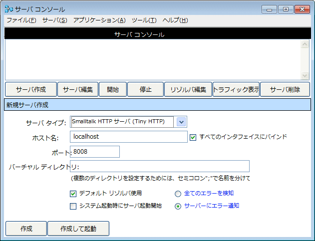6. 서버 타입을 Smalltalk HTTP Server(Tiny HTTP)로 변경해주십시오. 이 서버는 어플리케이션 개발이나 테스트에 사용합니다. 이것은 HTTP 서버를 사용하지 않고 Web 브라우저에서 요구를 수신하며 응답을 송신합니다. WevToolkit 시스템의 부수적인 추가 서버입니다. WebToolkit은 분리된 HTTP서버(Apache나 IIS)도 서포트 합니다.