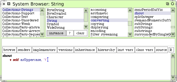 시스템 브라우저에서 String 클래스를 선택하고, Converting(변환) 프로토콜을 선택한 후, 메서드 생성 템플릿에, 메서드 1.2를 입력하시고 accept를 실행하십시오(참고: ↑를 입력하려면, ^를 입력하십시오).