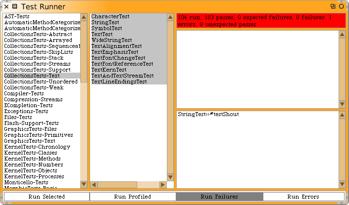 그림 1.22에 보이는 것처럼 테스트 실행 도중 오류가 있었음을 알리는 메시지를 보게 됩니다. 오류를 일으키는 테스트의 목록은 하단 오른쪽 패인에 보여집니다. 보시다시피 StringTest>>#testShout가 범인입니다. (참고로 StringTest>>#testShout는 StringTest 클래스의 "testShout" 메서드를 식별하기 위한 스몰토크 방식입니다.) 텍스트 줄을 클릭하면 오류가 생긴 테스트를 다시 실행할 것이며, 이 때 여러분은 "MessageNotUnderstood:ByteString>>shout"와 같은 식으로 발생한 오류를 보게 됩니다.