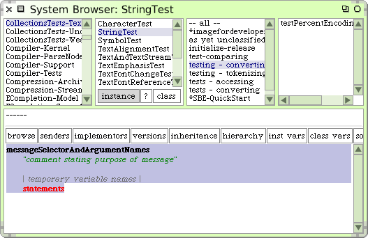 StringTest 클래스에서 브라우저를 열고, 메서드에 적합한 프로토콜을 선택하십시오. 이 같은 경우에는 그림 1.20에서 보시는 바와 같이 tests - converting 이 적당한 프로토콜입니다. 하단 패인의 강조된 텍스트는 스몰토크 메서드가 어떻게 생겼는지 알려주는 기본 템플릿입니다. 이 부분을 지우고 메서드 1.1 의 코드를 입력하십시오.