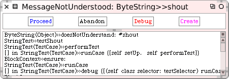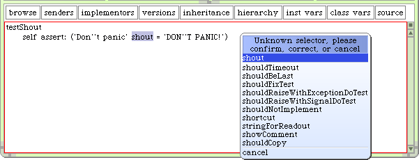 물론 이 오류는 확실히 기대하던 대로 입니다. 테스트를 실행하면 오류가 발생하는데. 어떻게 "shout" 해야 할 지에 대한 내용을 아직 작성하지 않았기 때문입니다. 그럼에도 불구하고, 테스트가 실패했음을 분명히 해두는 것은 바람직한 습관인데, 테스트 장치를 정확하게 설정 했으며 새 테스트가 실제로 실행중임을 확인시켜주기 때문입니다. 오류를 보고 나면, 디버거 창을 닫아서 실행 중인 테스트를 Abandon 할 수 있습니다. 참고로 스몰토크에서는 CreateNote 버튼을 사용하여 빠진 메서드를 정의하고, 새로 만든 메서드를 디버거에서 편집하며, 테스트를 Proceed 할 수 있습니다.