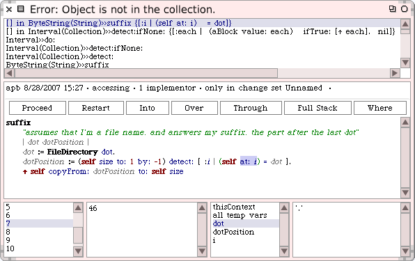 PreDebugwindow에는 어떤 오류가 발생했는지에 대해 알려주는 타이틀바(title-bar)가 있으며, 오류를 발생시켰던 메시지의 stack trace 상태를 출력합니다. trace의 출력은 아래쪽부터 시작해서 위쪽으로보면 됩니다. UndefinedObject>>DoIt 은 실행되는 컴파일된 코드를 나타내며, 사용자가 Workspace 에서 'readme.txt' suffix 를 이용해서 스퀵에게 print it을 요청한 시점에서 실행됩니다. UndefinedObject>>DoIt 에서 확인할 수 있는 'readme.txt' suffix 라는 코드는 당연히, ByteString 객체('readme.txt')에게 메시지 suffix 를 전송한다는 의미입니다. 이런 과정들을 거쳐 String 클래스에서 ByteString 으로 상속된 suffix메서드가 실행이 됩니다; ByteString(String)>>suffix에 관련된 모든 정보는 stack trace 의 다음줄부터 부호화(encoding) 됩니다. stack이 진행되면서, suffix 매서드는 그 안에서 자신에게 detect:... 메시지 를 보내고 결국 detect:ifNone 에 의해 errorNotFound 가 전송됨을 확인할 수 있습니다.