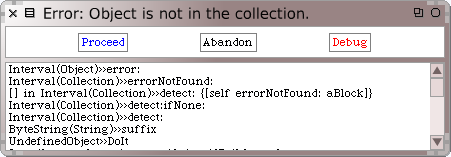 '''PreDebugwindow''' | '''PreDebugwindow'''에는 어떤 오류가 발생했는지에 대해 알려주는 타이틀바(title-bar)가 있으며, 오류를 발생시켰던 메시지의 stack trace 상태를 출력합니다. trace의 출력은 아래쪽부터 시작해서 위쪽으로보면 됩니다. '''UndefinedObject>>DoIt''' 은 실행되는 컴파일된 코드를 나타내며, 사용자가 Workspace 에서 'readme.txt' suffix 를 이용해서 스퀵에게 print it을 요청한 시점에서 실행됩니다. '''UndefinedObject>>DoIt''' 에서 확인할 수 있는 'readme.txt' suffix 라는 코드는 당연히, ByteString 객체('readme.txt')에게 메시지 suffix 를 전송한다는 의미입니다. 이런 과정들을 거쳐 String 클래스에서 ByteString 으로 상속된 suffix메서드가 실행이 됩니다; '''ByteString(String)>>suffix'''에 관련된 모든 정보는 stack trace 의 다음줄부터 부호화(encoding) 됩니다. stack이 진행되면서, suffix 매서드는 그 안에서 자신에게 detect:... 메시지 를 보내고 결국 detect:ifNone 에 의해 errorNotFound 가 전송됨을 확인할 수 있습니다. | ||