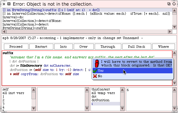 현재 detect: 내부의 블록 내부에서 코드를 실행하고 있기 때문에 여러 개의 stack 프레임은 변경사항을 적용하기위해 포기해야만 합니다. 스퀵은 수정작업이 사용자가 원하는 것인지를 물어보며(그림 6.29를 보십시오) 만약 yes를 클릭한다고 가정하면, 새로운 메서드를 저장(그리고 컴파일)할 것입니다.