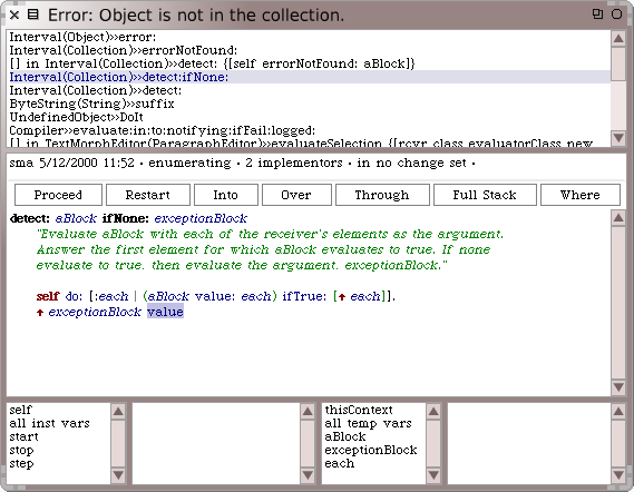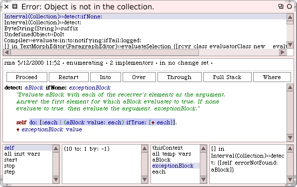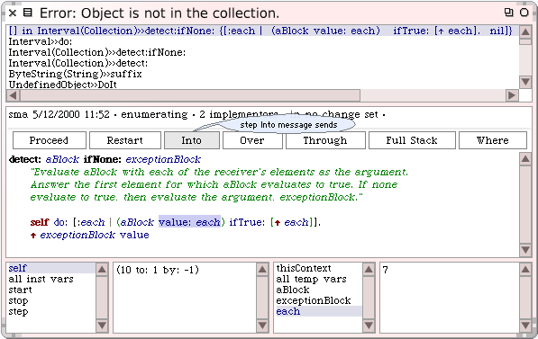 {{CommentSqueak|당신이 stack trace 의 정보들중 어떤 라인을 클릭해도, 디버거가 열립니다. 디버거는 문제가 생긴 해당 메서드에 이미 포커스된 상태로 열리게 됩니다.}} | |||