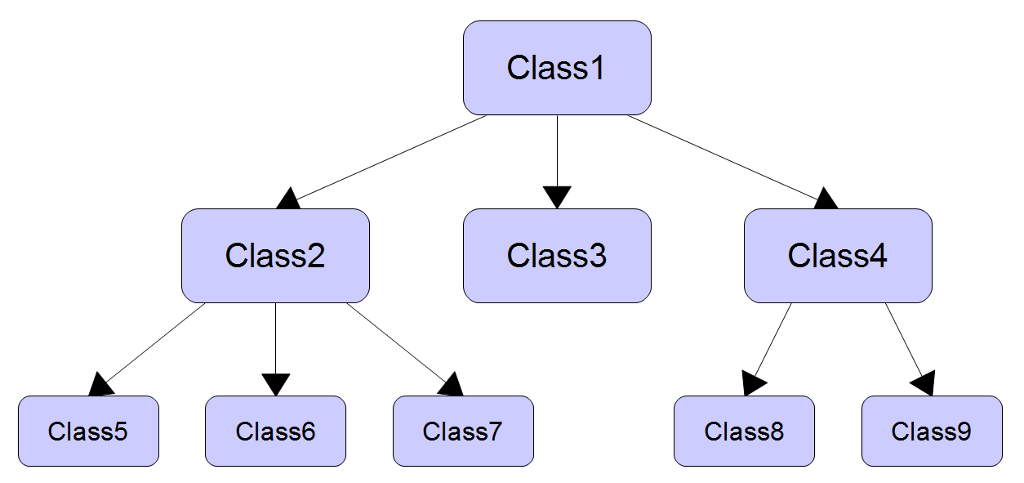 위의 다이어그램에서 어떤 클래스들은 하위 클래스를 가지고 있으며, 모든 클래스는 Class1을 제외하고 상위클래스를 가지고 있다. 클래스들은 하나 이상의 하위클래스들을 가질 수는 있어도, 여러 개의 상위클래스를 가질 수는 없습니다.