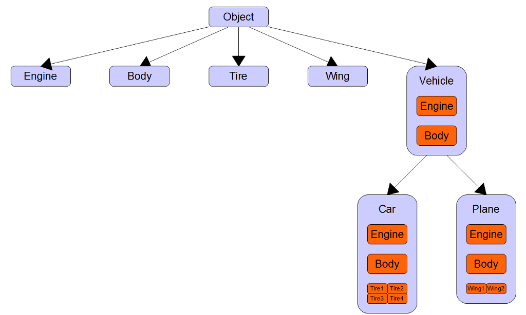 이 그림에서 각 노드는 클래스를 나타냅니다. 8개의 클래스가 있으며, 각각 Object, Engine, Body, Wing, Tire, Vehicle, Car, Plane이라고 이름붙였습니다. Engine, Body, Wing 그리고 Vehicle은 모두 Object의 모든 하위 클래스입니다. Car와 Plane은 Vehicle의 하위클래스입니다. 하나의 클래스는 다른 클래스들의 인스턴스로 구성할 것입니다. Vehicle, Car, Plane 클래스 안의 그러한 예제를 봅시다. Vehicle 클래스는 Engine과 Body 클래스의 인스턴스를 갖고 있습니다. Car와 Plane 클래스들은 Vehicle의 하위클래스이기 때문에 상위클래스인 Vehicle의 모든 속성과 행동을 상속받습니다. Engine과 Body 객체들을 상속받은 후, 두 객체를 구분하기 위해 Car 클래스에는 4개의 Tire 객체들을 추가하고, Plane 클래스에는 두 개의 Wing 객체를 추가합니다.