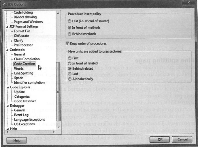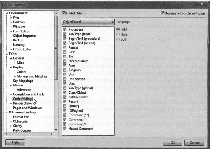 예를 들어, Uses 확인상자를 활성화하면 코드 내 모든 uses 문 앞에 [-] 아이콘을 위치시켜 각 uses 섹션을 한 번의 클릭으로 접을 수 (또는 접기 해제) 있다. {%Region} 지시어는 임의로 접을 영역을 정의할 수 있도록 해준다 (Pascal | 예를 들어, Uses 확인상자를 활성화하면 코드 내 모든 uses 문 앞에 [-] 아이콘을 위치시켜 각 uses 섹션을 한 번의 클릭으로 접을 수 (또는 접기 해제) 있다. {%Region} 지시어는 임의로 접을 영역을 정의할 수 있도록 해준다 (Pascal 프로그램식의 포함 여부와 상관없이). | ||