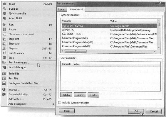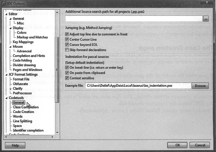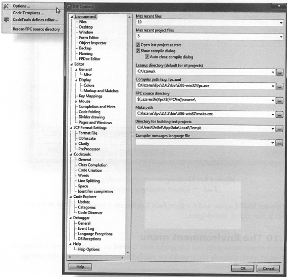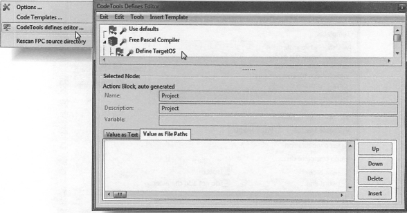 Environment ⇒ CodeTools Defines Editor... 메뉴는 Codetools 설정 보기를 연다. 표시된 값은 Codetools에만 유효하며 컴파일러에는 적용되지 않는다. 검색 경로는 Environment→Options 설정, 컴파일러 설정, 패키지 에디터, 프로젝트 인스펙터에 의해 설정된다.