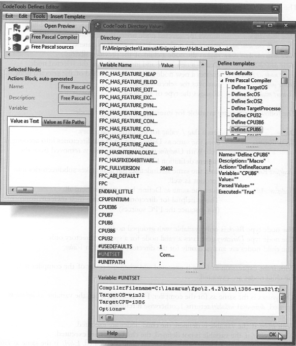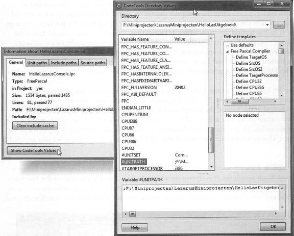 IDE는 이러한 값에 대한 노드를 자동으로 생성한다. CodeTools Defines Editor 대화창은 사용자가 이러한 노드 각각에 대해 Define templates(템플릿 정의)를 검사하고 편집하도록 해준다. 모든 값과 변수는 매크로를 포함할 수 있다. 대화창은 미니 애플리케이션으로서 자체 메뉴를 포함한다 (Exit, Edit, Tools, Insert Template).