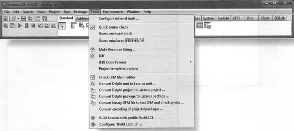 메인 메뉴의 상위에 위치한 라자루스 메뉴는 일상 프로그래밍에서 필요로 하는 기능으로 접근할 수 있도록 해준다. 내장된 기능 외에도 IDE를 다양한 방식대로 맞춤 사용할 수 있으며 자주 사용하는 메뉴 옵션을 키보드에 단축키로 설정할 수 있다 (Environment ⇒ Options... ⇒ Editor, Key Mappings).