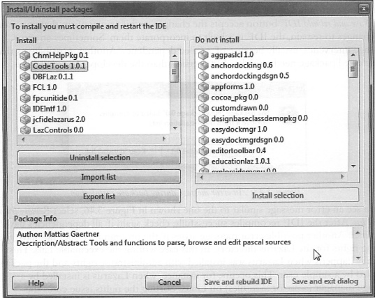 File ⇒ Print 옵션은 라자루스 패키지 printers4lazide가 설치되었을 때만 표시된다. 설치되지 않았다면 Package ⇒ Install Uninstall packages... 를 이용해 설치할 수 있다.