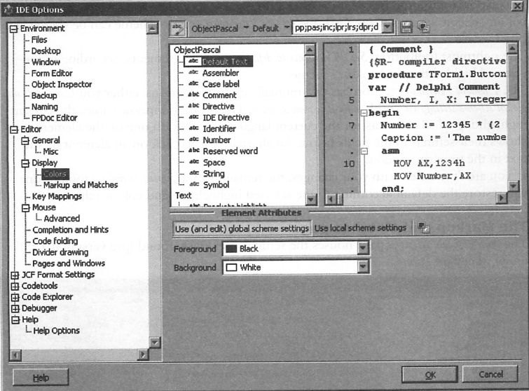 그 옆의 콤보상자는 (기본 값: ObjectPascal) 사용자가 사용 중인 각 프로그래밍 언어에 색상 배합을 선택하도록 해주고, 각각은 사전에 정의된 | 그 옆의 콤보상자는 (기본 값: ObjectPascal) 사용자가 사용 중인 각 프로그래밍 언어에 색상 배합을 선택하도록 해주고, 각각은 사전에 정의된 문법 하이라이트를 가진다. 이용 가능한 '언어'는 다음과 같다: | ||