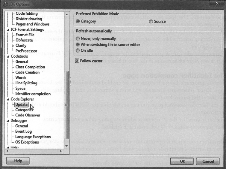 Preferred Exhibition Mode 섹션에서는 코드 익스플로러 리스트를 Category(카테고리) 별로 그룹화할 것인지 아니면 Source(소스) 코드에서 항목의 순서대로 표시할 것인지를 결정한다. Category를 선택하면 카테고리 설정(preference)을 다음 페이지에서 설정할 수 있다. 자동 재스캐닝의 트리거는 Refresh automatically 옵션에서 설정된다: Never, only manually (예: Refresh 버튼을 클릭 시에만), When switching file in source editor, 또는 On idle.