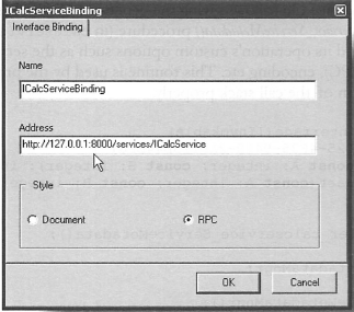 Operation properties 대화창은 동작 인수(operation argument)의 추가, 편집, 삭제 기능을 제공한다. Argument 대화창은 (아래 그림) 동작에 필요한 인수를 추가하기 위해 Add 라는 이름으로 사용되어 왔다. 모든 동작이 인터페이스에 추가되면 그림 11.7과 같이 'Edit binding' 팝업 메뉴 항목을 통해 바인딩 에디터 대화창이 호출된다.