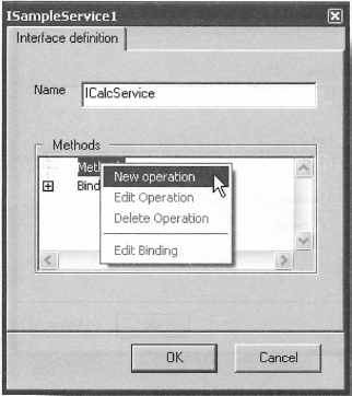 본 장에서 첫 번째 예제는 간단한 정수 계산 서비스를 다룬다. 이 서비스는 두 가지 정수 연산을 제공한다: Add와 Subtract. 서비스 인터페이스를 정의하기 위해 우리는 WST 타입 라이브러리 에디터를 사용할 것이다. 그 인터페이스에 대해 두 가지 연산을 정의하는 인터페이스가 생성된다. 우리는 인터페이스 생성 대화창을 이용해 인터페이스를 생성할 것인데, 이는 아래 스크린숏에서 보이는 바와 같이 'Edit ▷ Create Interface' 메뉴 항목을 통해 이용할 수 있다. 인터페이스 생성 대화창은 에디터의 소스 보기 페이지 중 아무 곳이나 오른쪽 마우스를 클릭하면 팝업되는 'Create Interface' 메뉴 항목을 통해 이용할 수 있다.
